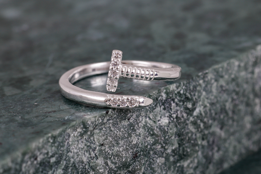 ANEL EM PRATA, ABERTO, PREGO MEIO CRAVEJADO E MEIO TRABALHADO, 8mm LARGURA