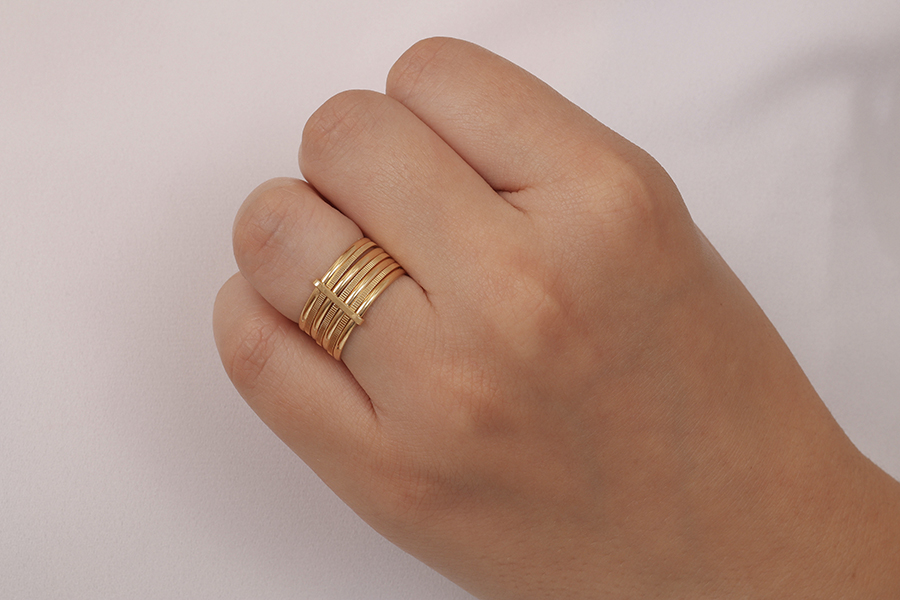 ANEL EM PRATA, 3 FIOS EM FILIGRANA E 1 FIO MEIO CRAVEJADO, 13mm LARGURA