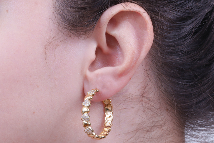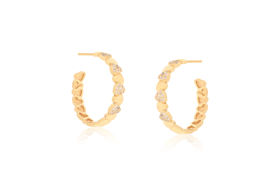 BRINCO BANHADO EM OURO, CORAÇÃO 9mm LARGURA COM ZIRCÔNIAS BRANCAS OU COLORIDAS