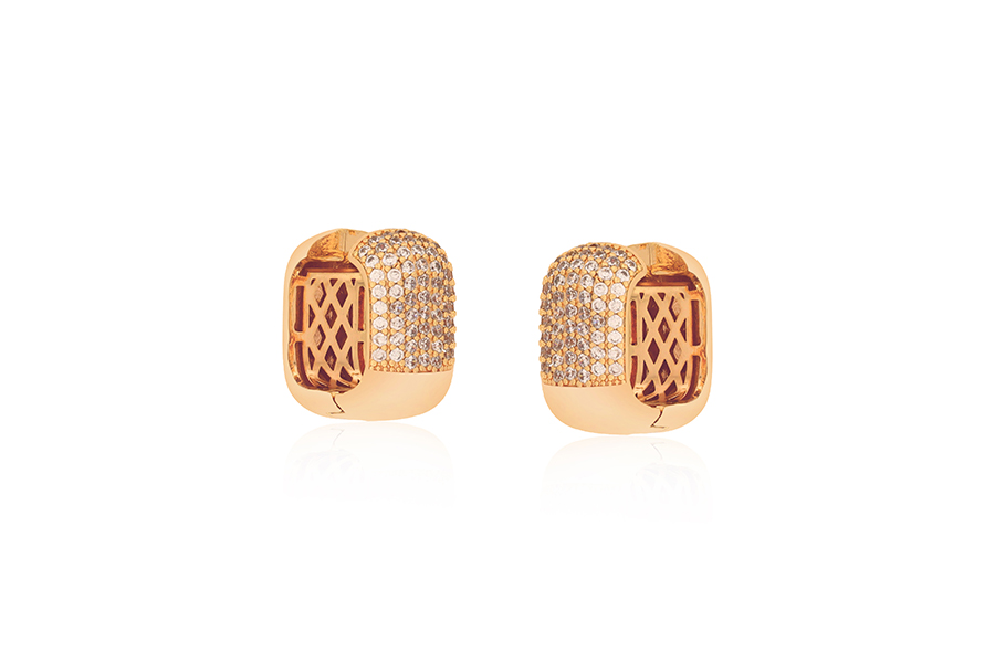 BRINCO BANHADO EM RÓDIO BRANCO, RETANGULAR 13x11mm, COM 8 ZIRCÔNIAS E PONTOS