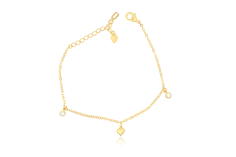 PULSEIRA BANHADA EM OURO, ELO 4mm LARGURA, 20cm COM EXTENSOR, DOIS CORAÇÕES E CORAÇÃO GATO 11mm LARGURA